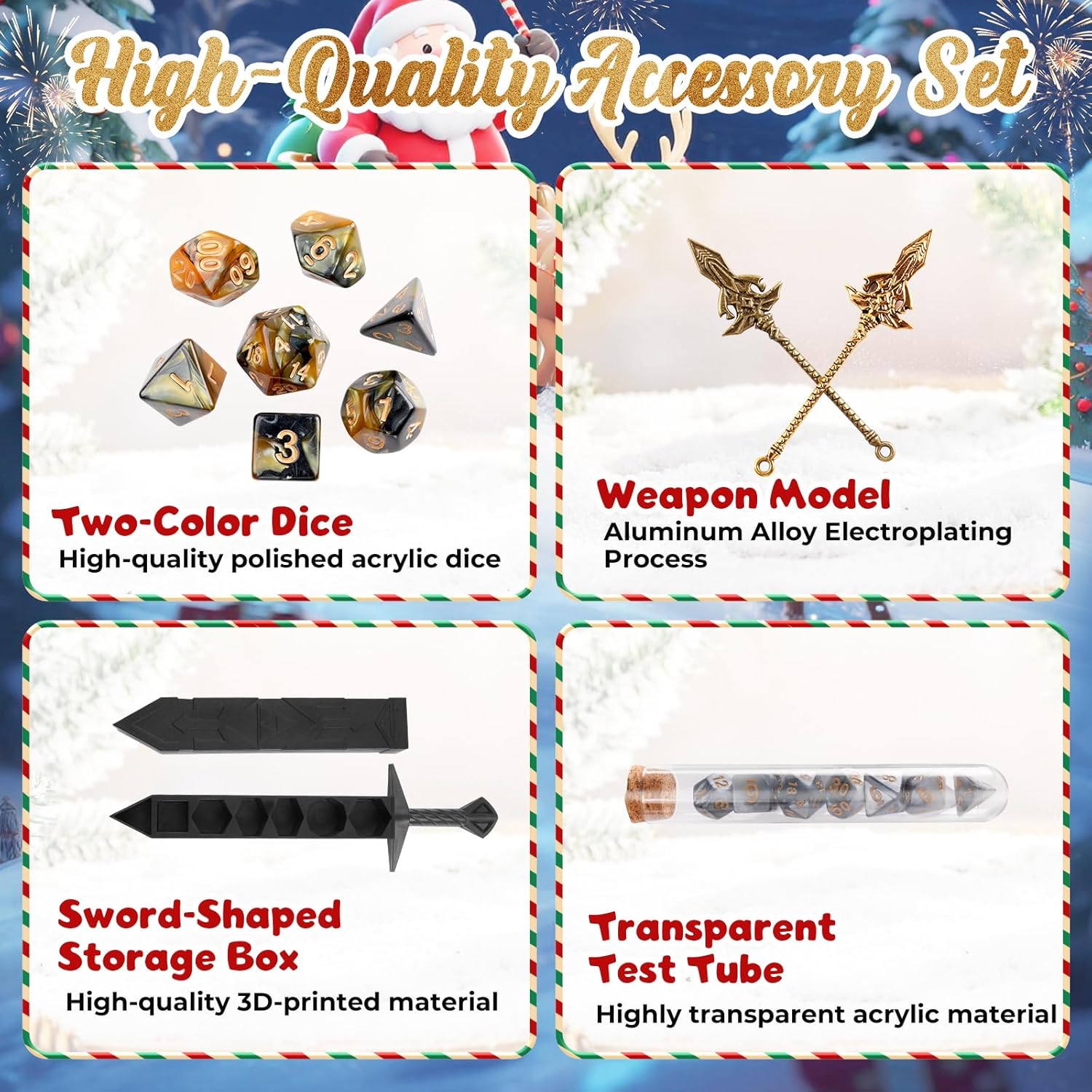 24-Day Countdown: Enjoy the thrill of a 24-day countdown revealing a stunning collection of 28 polyhedral dice, 2 decorative swords, a sword-shaped storage box, and a glass tube, making it an essential collectible for all dice enthusiasts.