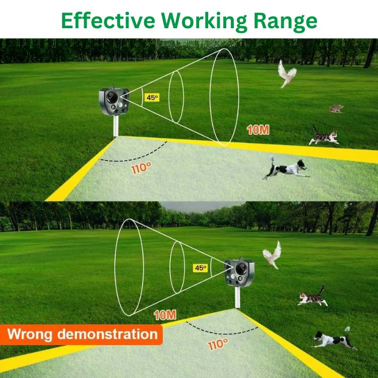 This device features a high-precision 110° PIR motion sensor that detects movement within a 9-meter range. When it senses activity, it emits a powerful ultrasonic pulse and activates flashing LED lights, effectively scaring away pests instantly.